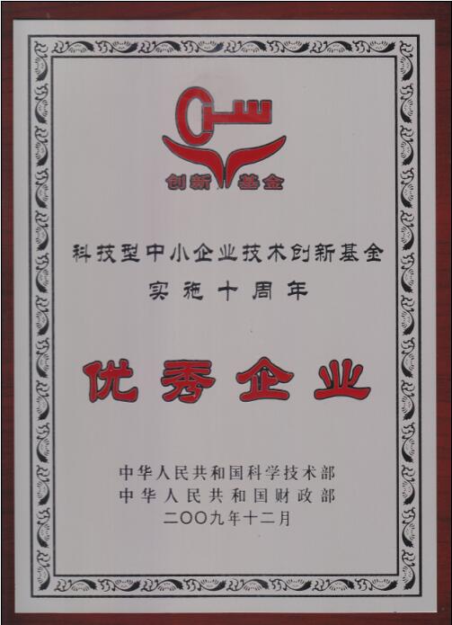 在科技部和財政部召開的科技型中小企業(yè)技術創(chuàng)新基金實施十周年總結大會上,我公司被授予“全國科技型中小企業(yè)技術創(chuàng)新基金工作優(yōu)秀企業(yè)”榮譽稱號。