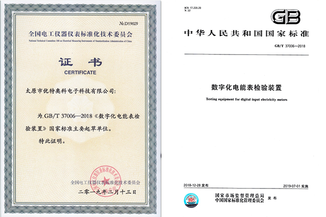 優(yōu)特奧科作為主要起草單位的國(guó)家標(biāo)準(zhǔn)《GB/T37006-2018數(shù)字化電能表檢驗(yàn)裝置》于2018年12月28日發(fā)布,2019年7月1日實(shí)施。