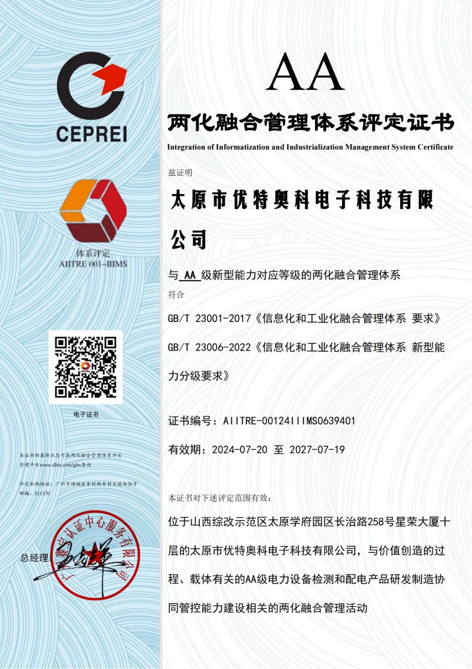 近日,我公司正式獲得兩化融合管理體系A(chǔ)A級(jí)評(píng)定證書,標(biāo)志著在信息化與工業(yè)化融合方面取得顯著進(jìn)展。此次評(píng)定嚴(yán)格按照國(guó)家標(biāo)準(zhǔn),歷經(jīng)多個(gè)環(huán)節(jié),最終順利達(dá)標(biāo)。